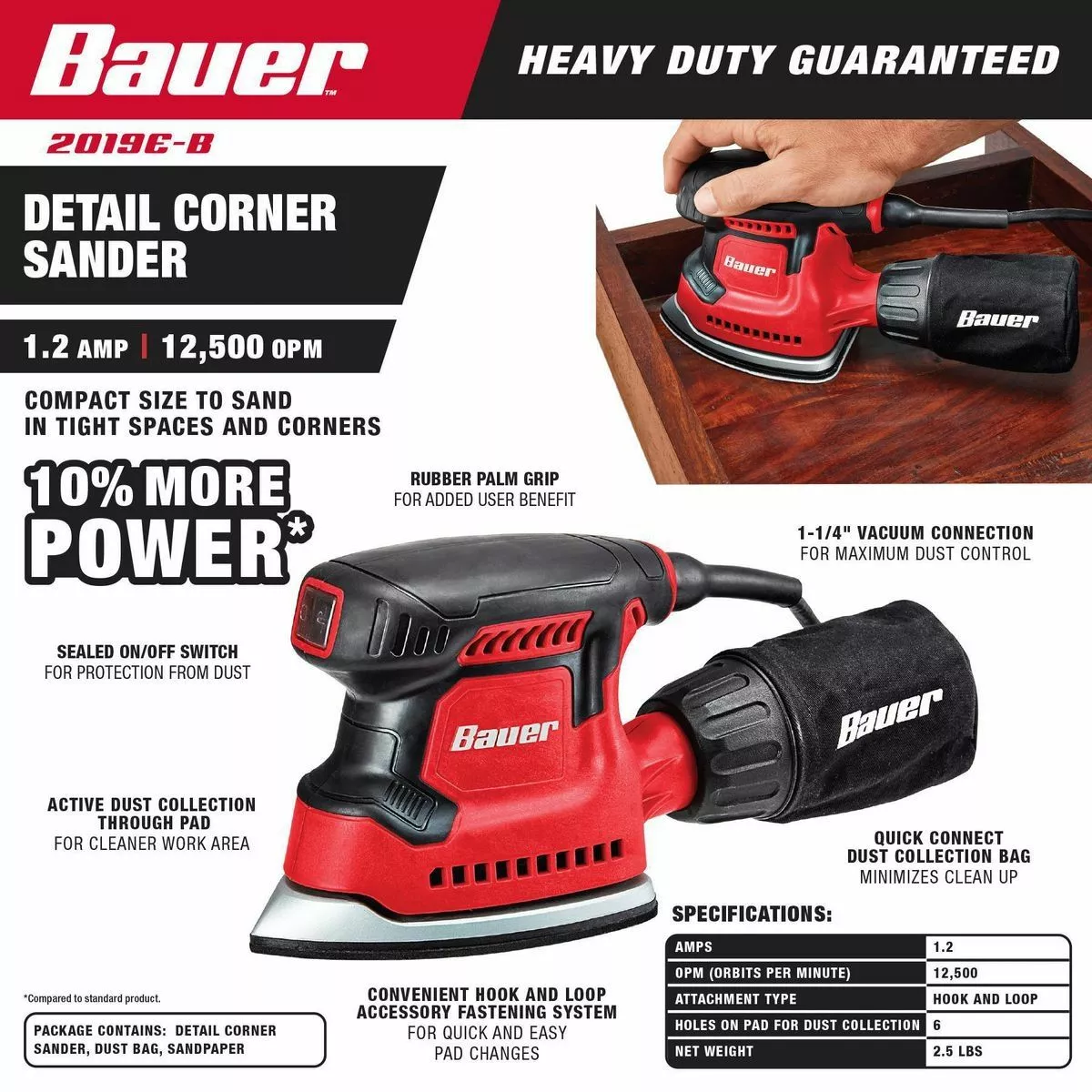 The BAUER™ 1.2 Amp Corner/Detail Sander with Sealed On/Off Switch has a powerful motor that delivers 10X more power* in tight spots and corners making it ideal for fast stock removal and finishing. Heavy Duty Guaranteed for up to 12,500 OPM .