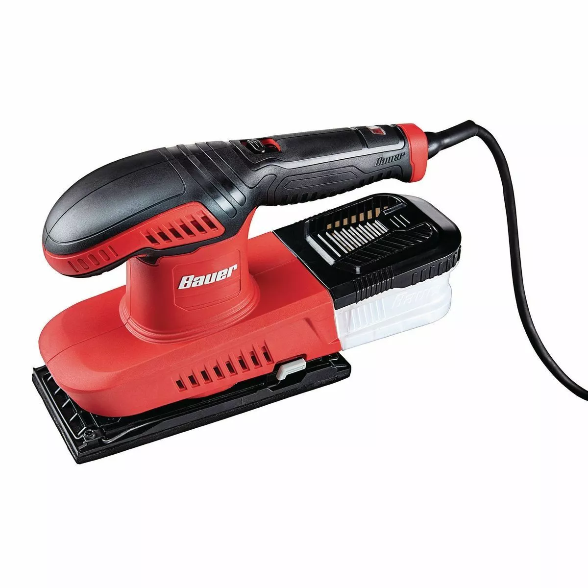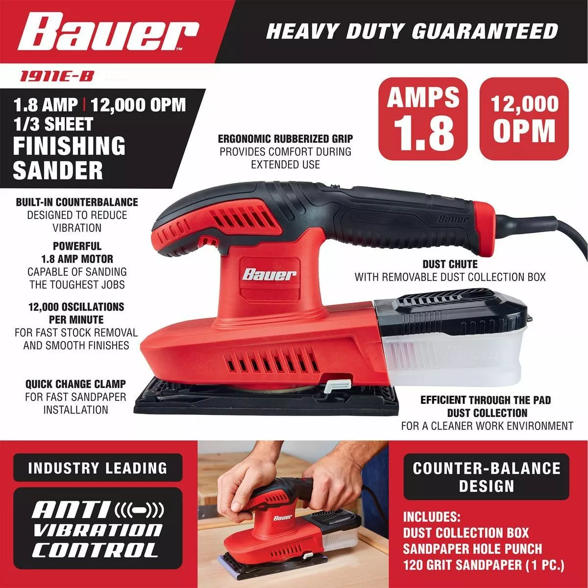 Industry-leading anti-vibration control combined with a counter-balanced design make this heavy duty BAUER™ Orbital 1/3 Sheet Sander with Anti-Vibration easier to use on large projects. Designed for fast stock removal this sander has a powerful 1.8 Amp motor that delivers up to 12,000 OPM for a smooth, clean finish. Efficient through-the-pad dust collection keeps the work area clean. The easy-to-use quick change clamp makes sanding sheet replacement fast and easy.