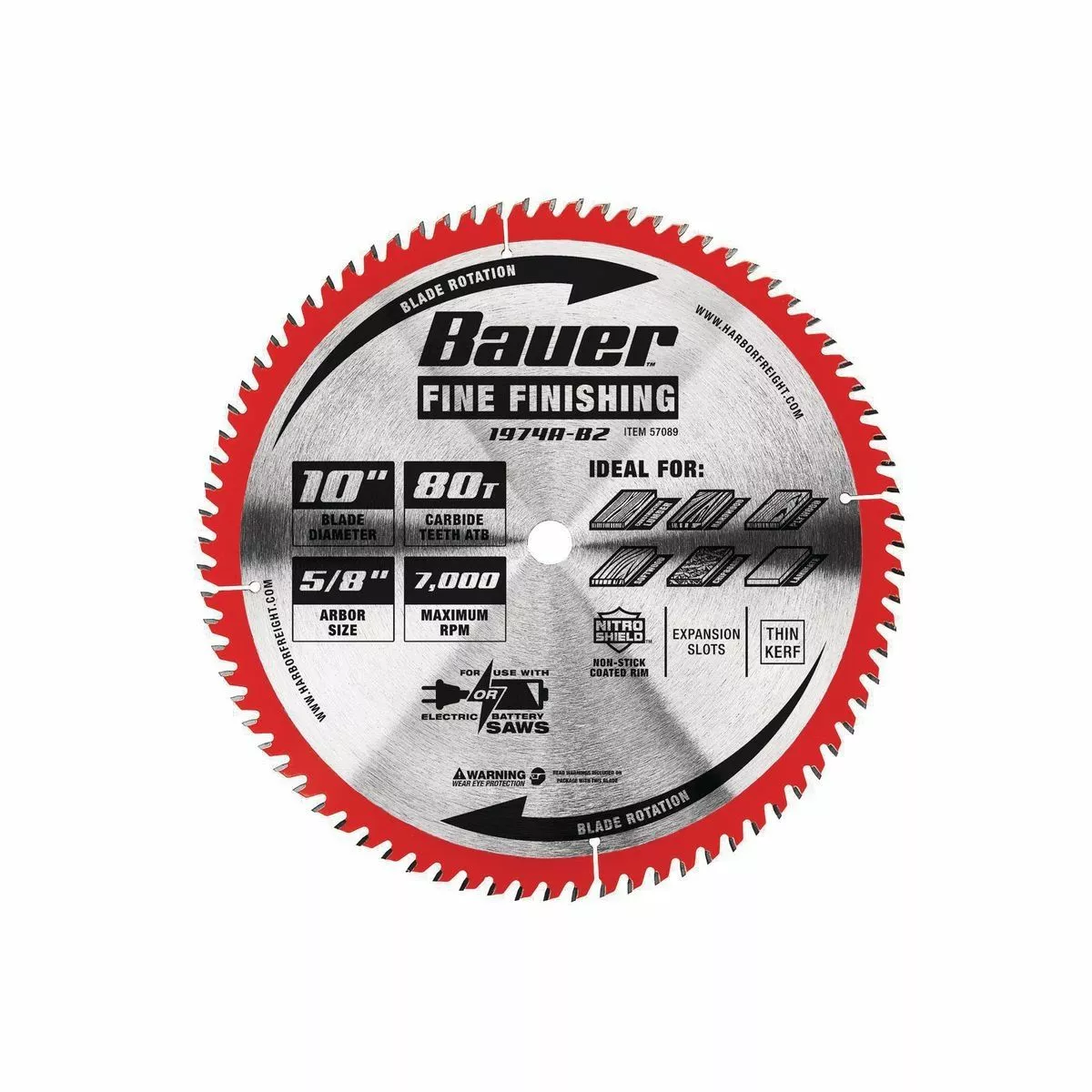The BAUER™ 80T Fine Finishing Circular Saw Blade has super-sharp construction grade C3 carbide teeth for fine cuts most lumber even if it’s wet or pressure-treated. The Nitro Shield™ non-stick coating protects the blade from heat, gumming, and corrosion.