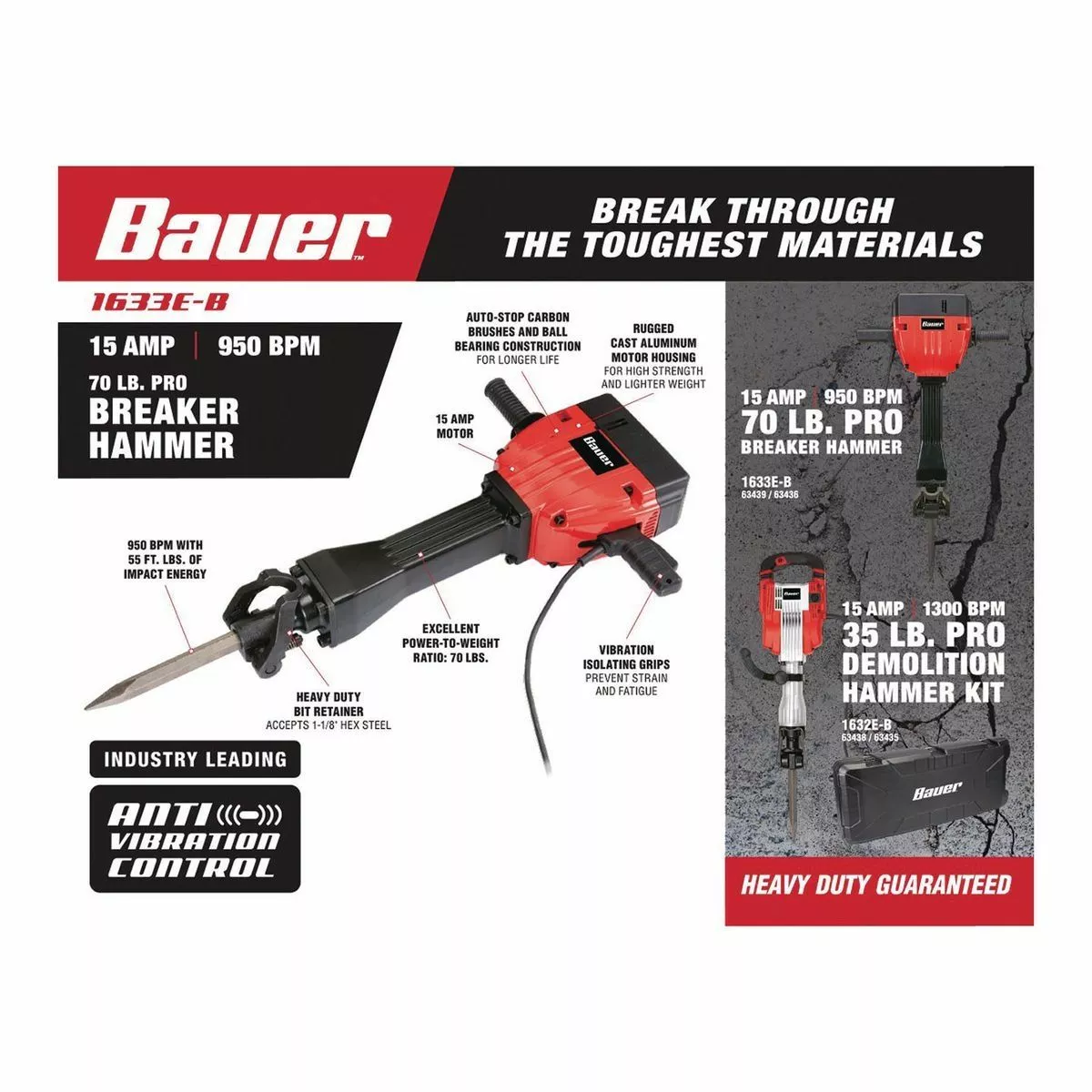 The BAUER™ corded 70 Lb. Breaker Hammer provides high efficiency with a 15 amp motor delivering 55 ft. lbs. of impact energy. The anti-vibration design plus rubber isolator grips reduce fatigue and help prevent strain during use. The heavy duty breaker hammer has an all ball bearing motor for long service life. Accepts both collared and collarless chisels.