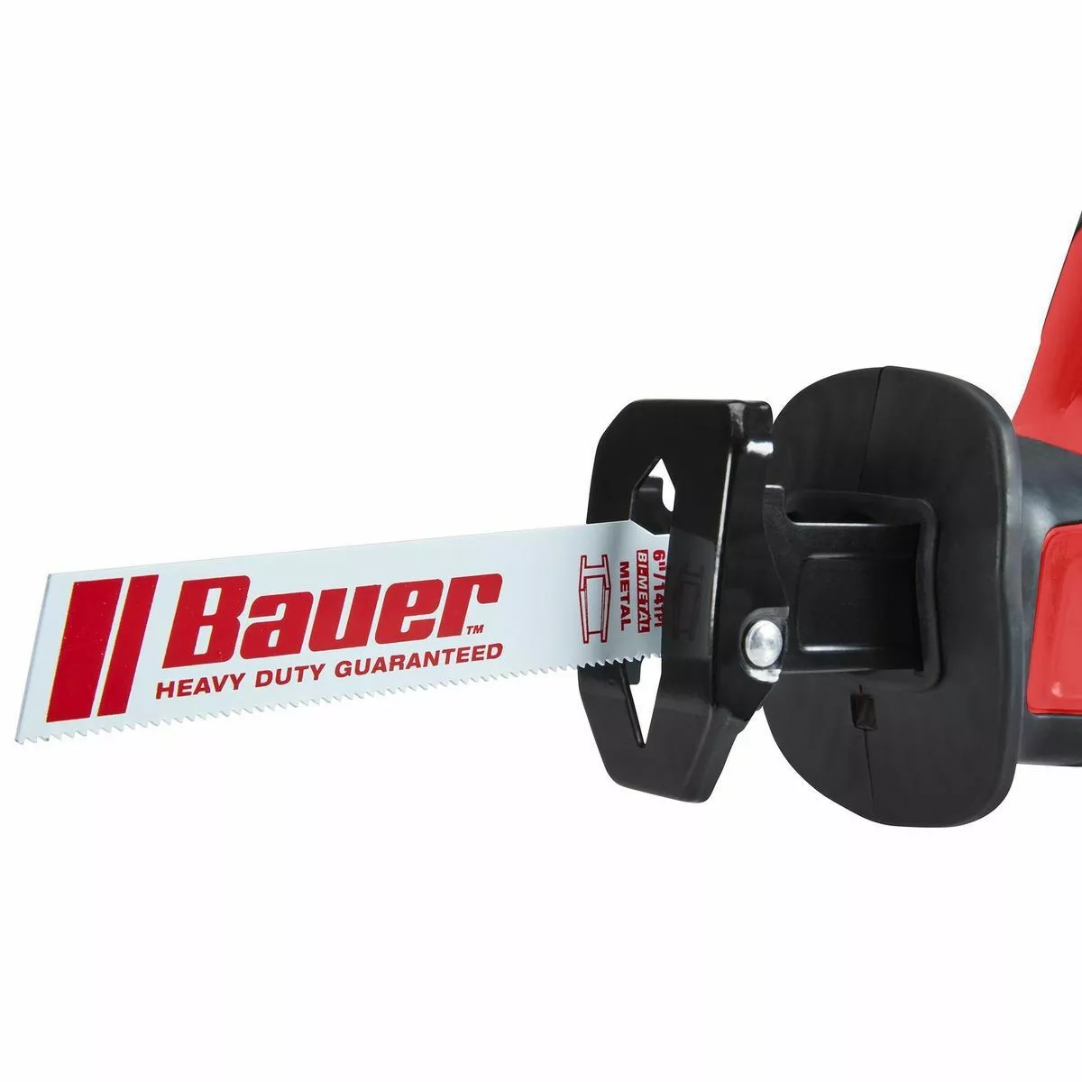 The BAUER™ 20V Brushless Cordless Compact Reciprocating Saw is 29% more compact* for easy one-hand use ideal for overhead cutting. This reciprocating saw uses brushless technology for longer tool life, extended run-time and up to 3000 SPM for the power to handle the toughest jobs. The 7/8 in. stroke delivers for fast, efficient cuts. The pivoting shoe provides cutting control in a variety of applications. Designed for keyless blade changes for less downtime between cuts.