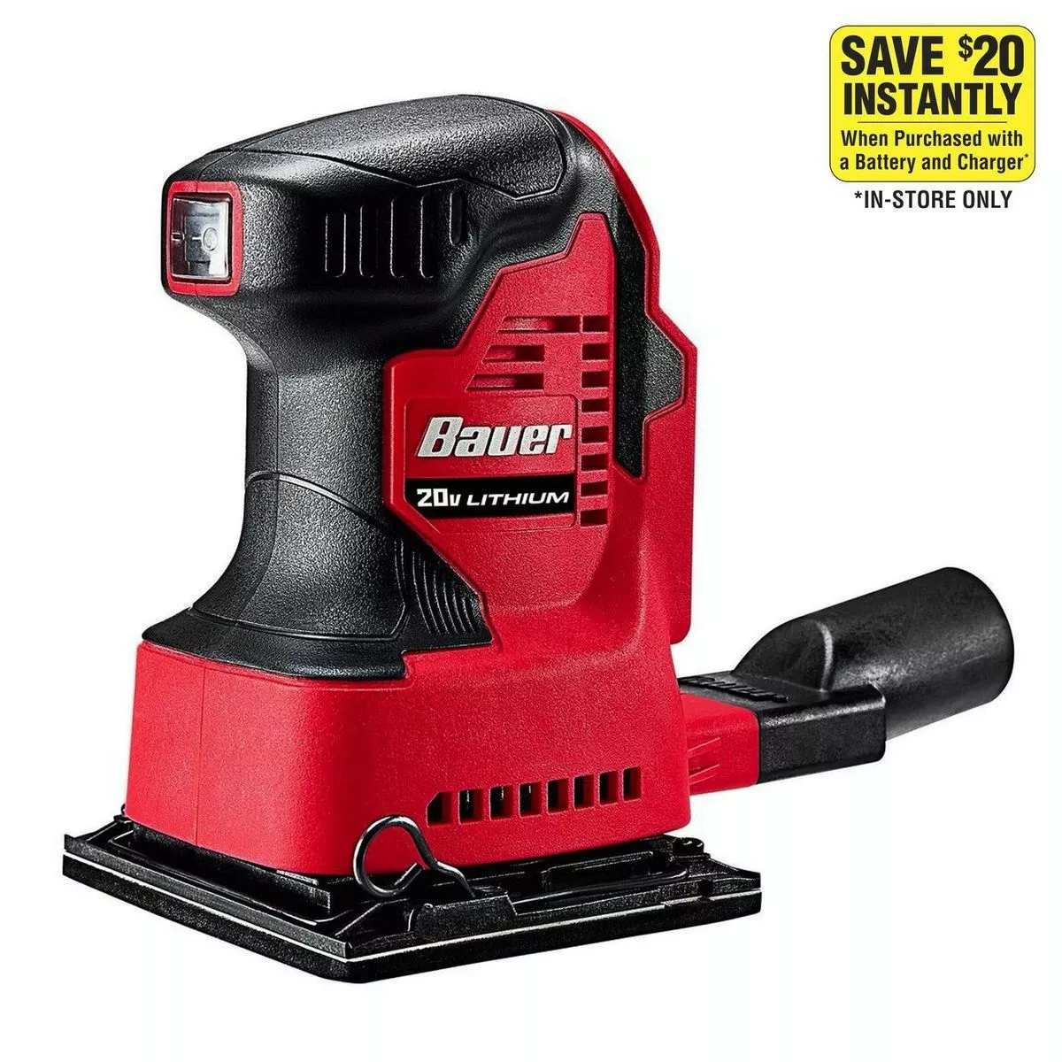 The BAUER™ 20V Cordless 1/4 Sheet Sander delivers 12,000 OPM, making it ideal for a variety of finishing applications. The convenience of cordless operation makes it easy to move from job to job. The 1/4 sheet quick-change design provides a tight hold on most sandpapers. A lock-on switch makes this sander easy to control for long periods of sanding. The sander comes complete with dust bag, vacuum attachment, sandpaper punch plate and 4 pieces of sandpaper. With over 30 minutes of runtime on a fresh battery, you will always have enough power to get the job done.