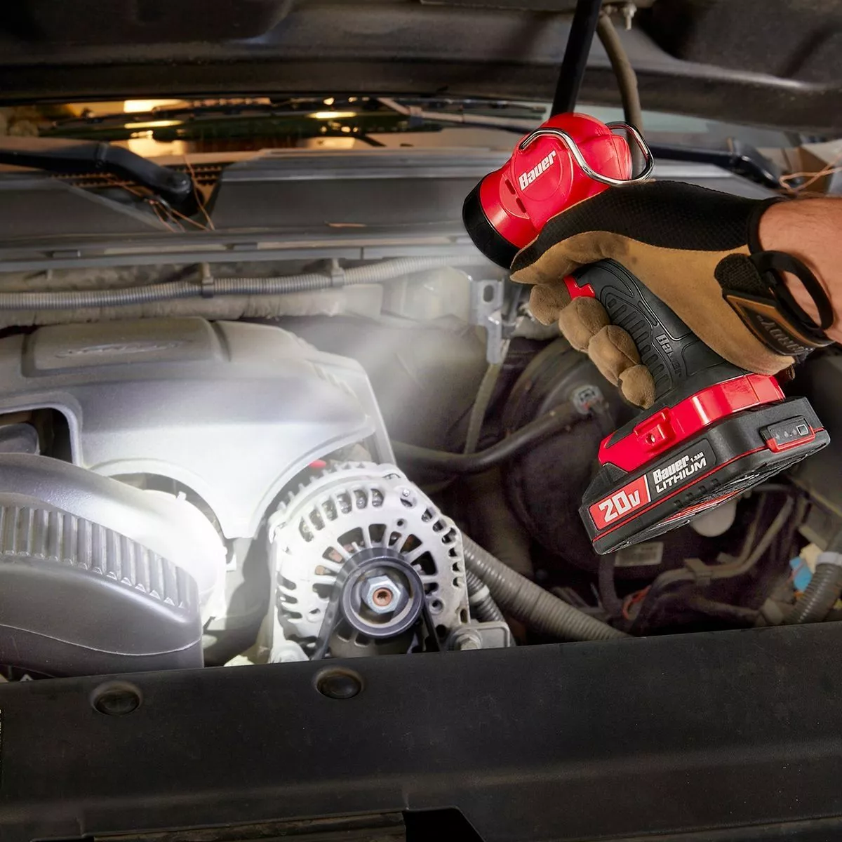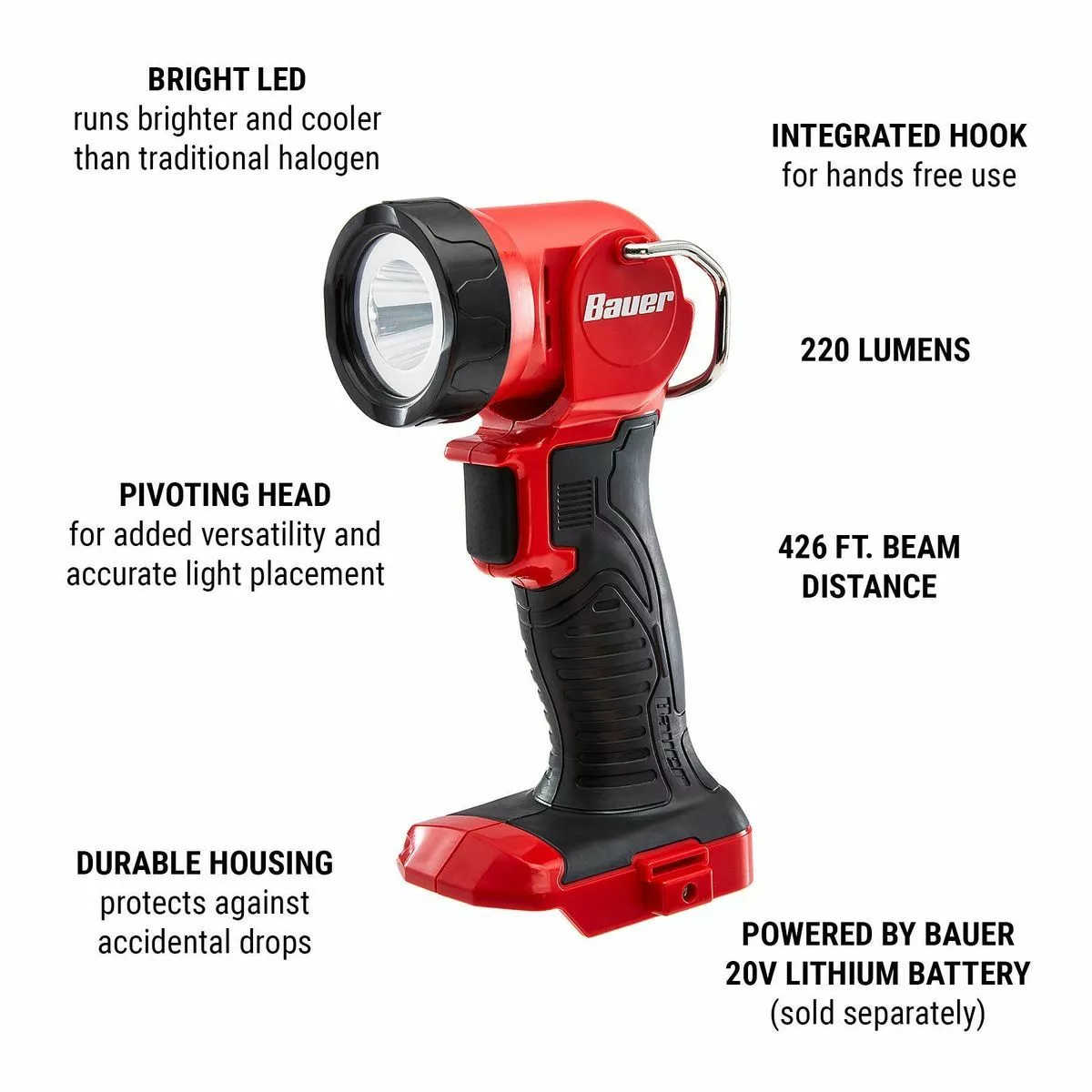 The BAUER™ 20V Cordless 220 Lumen Work Light provides 220 lumens of bright white light. The sturdy base lets you use the light in a stand-alone position or as a hanging work light with the integrated hook. The multi-position head pivots up to 110° for the best lighting angle. The super-efficient LED delivers up to 24 hours of runtime and stays cooler than incandescent lights. With an ergonomic rubberized grip and durable impact-resistant housing, this light is the ultimate addition to any tool bag. Powered by the BAUER™ 20V Lithium-Ion Battery System, sold separately.