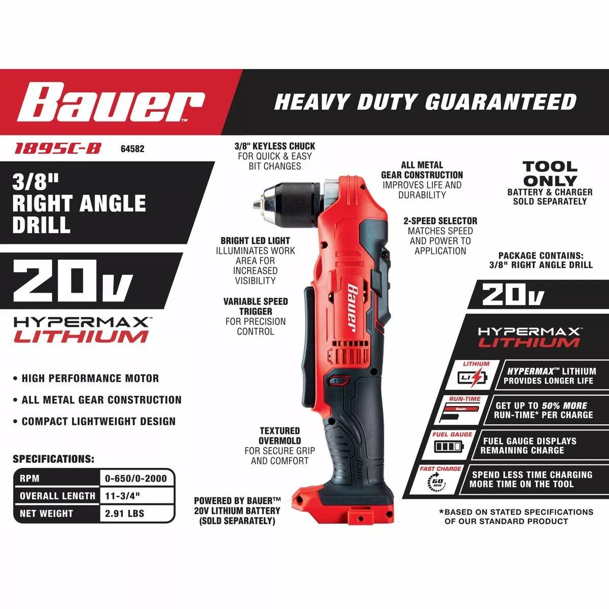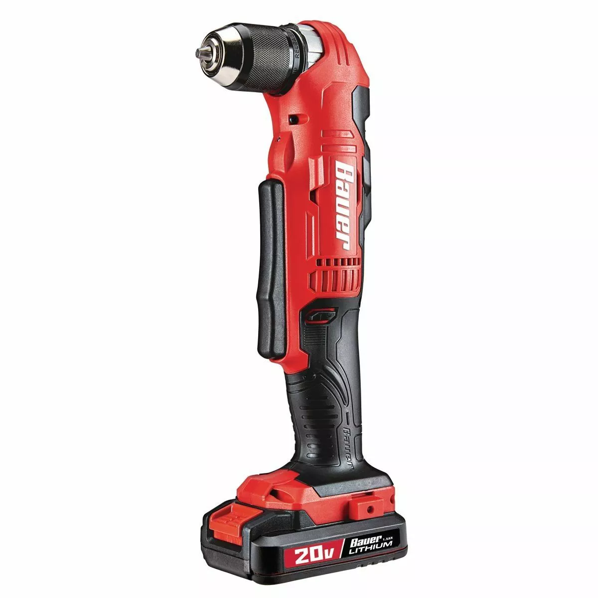 The BAUER™ 20V Cordless 3/8 in. Right Angle Drill is the perfect configuration for drilling between studs and joists or other close-quarters work. The balanced right angle design is compact yet delivers a variable speed range of 0-650/0-2000 RPM. The all-metal gear construction ensures heavy duty performance with daily use. The LED gives you a clear view in dark spaces. Compatible with all BAUER™ 20V tools. Buy with confidence with an included no-questions-asked risk-free trial, extendable for up to 2 years.