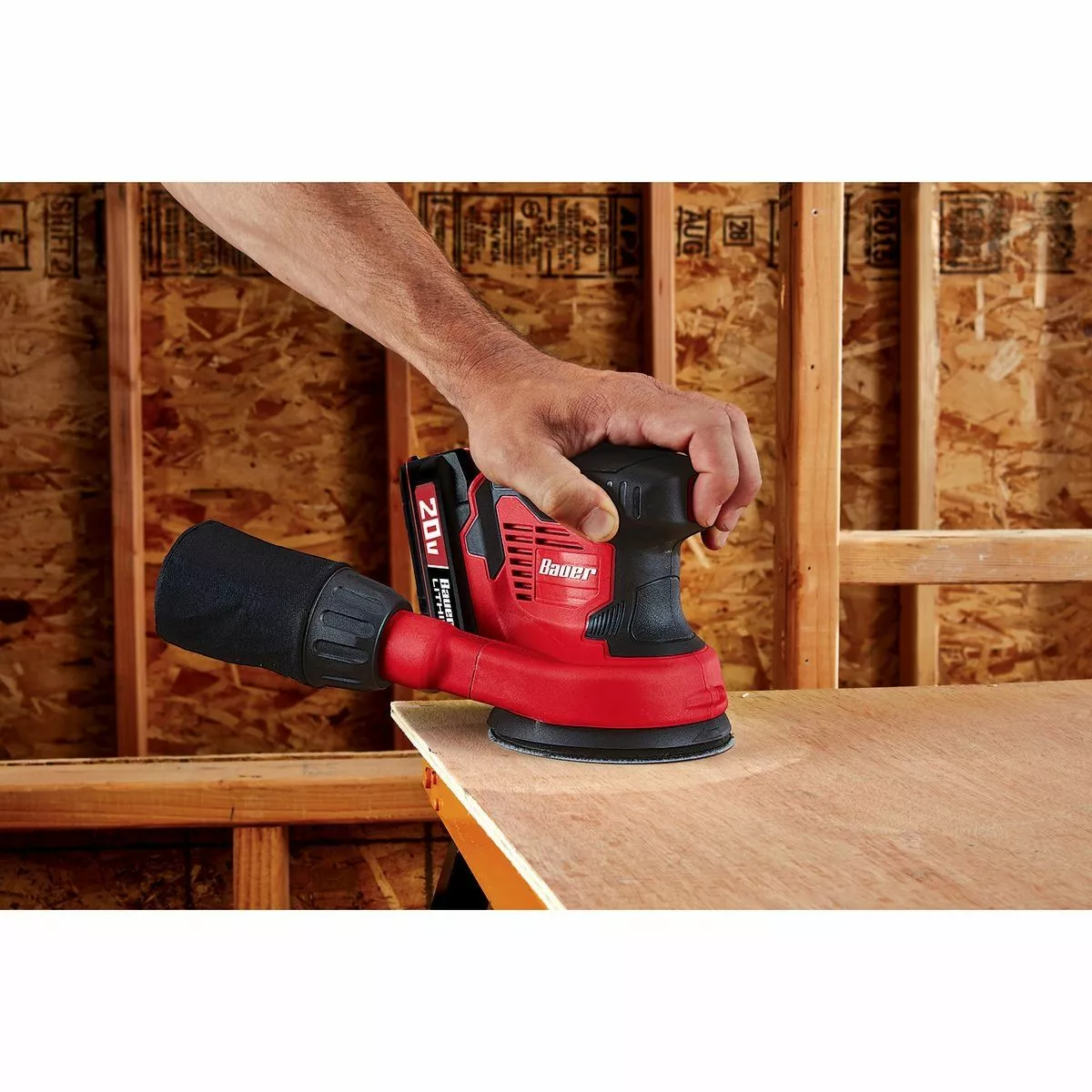 Built for heavy use, the BAUER™ 20V Cordless 5 in. Random Orbital Sander delivers 10,000 OPM with 3mm orbit action for smooth, swirl-free finishes. Designed with a comfort rubber palm grip and lock-on switch for extended use and less fatigue. Convenient hook and loop sandpaper attachment fits universal, 5-hole and 8-hole sandpaper discs. This sander includes an assortment of sandpaper of varying grits. Battery and charger sold separately. Buy with confidence with an included no-questions-asked risk-free trial, extendable for up to 2 years.