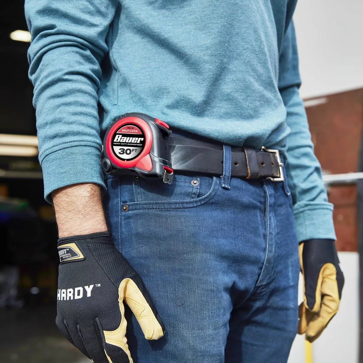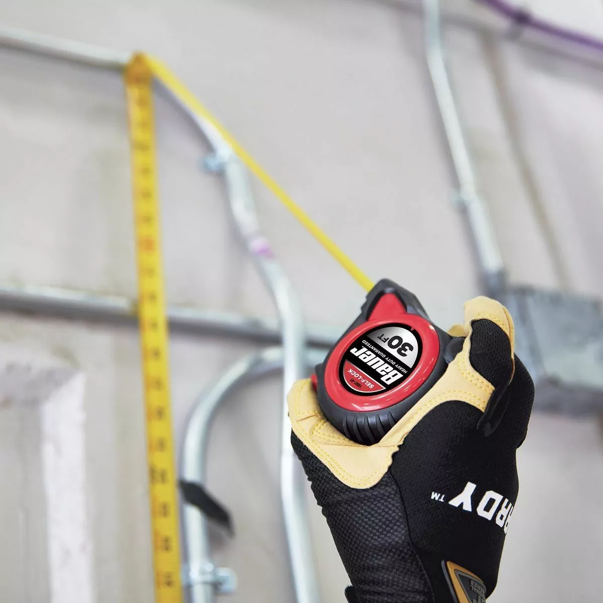 The durable steel blade on this BAUER™ Self-locking Tape Measure instantly locks in place when you extend it – no unexpected snap-back. The heavy duty ABS case has a no-slip rubberized grip for a secure hold. The blade is marked in 1/16ths of an inch and the markings are nylon-bonded for long life.
