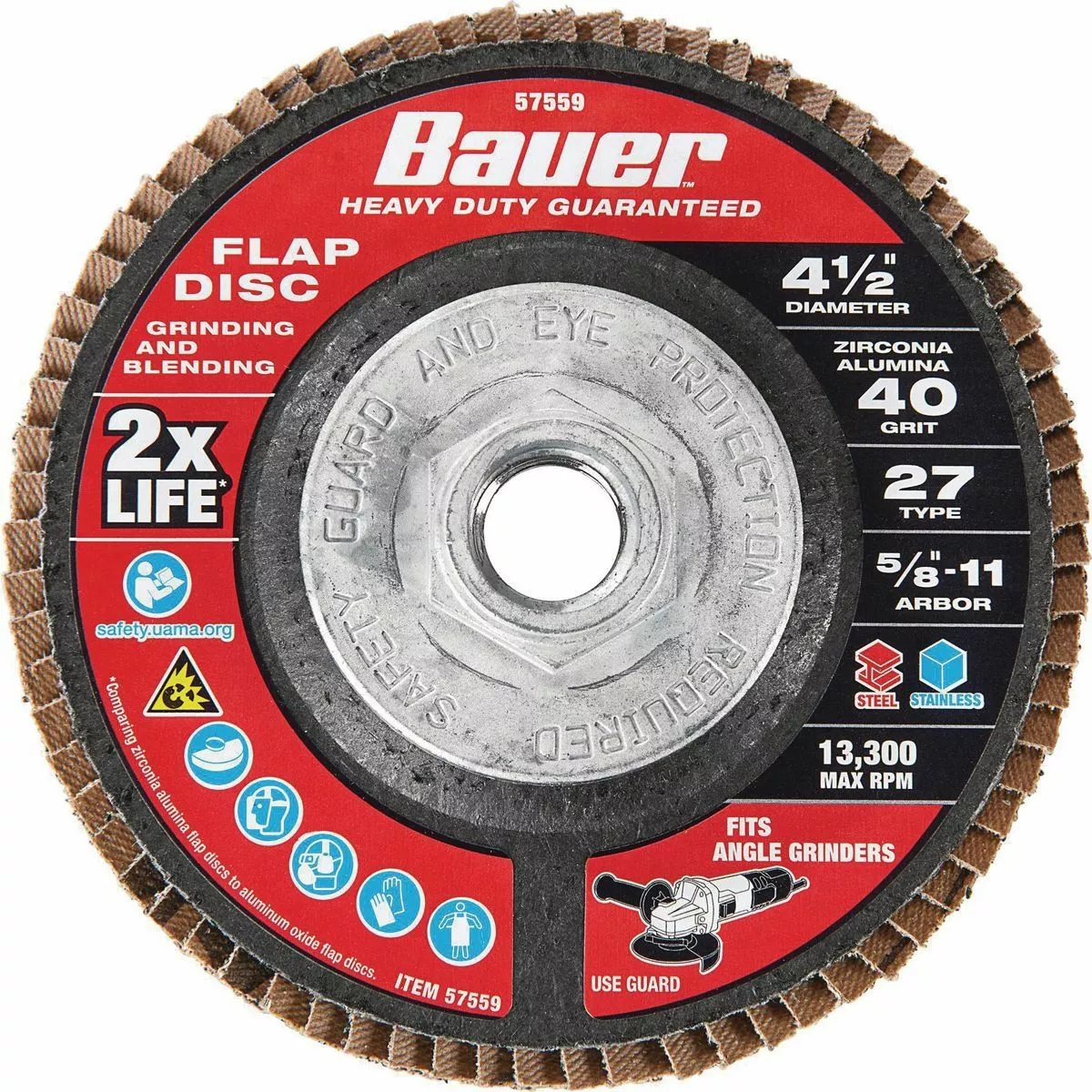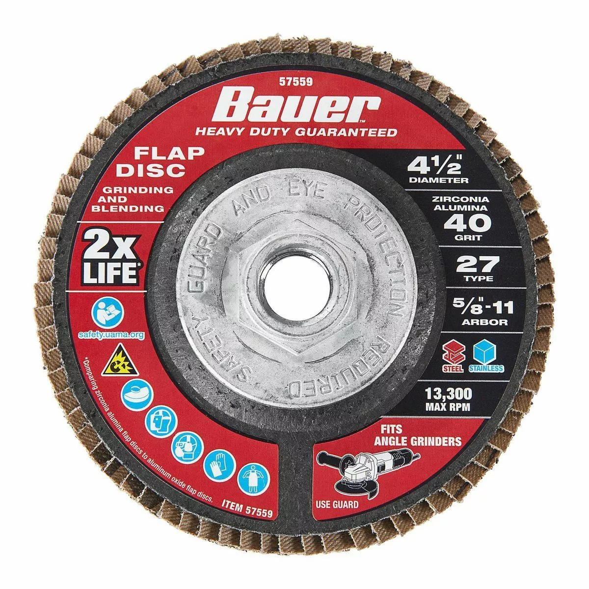 The BAUER™ 4-1/2 in. x 5/8 in.-11 40-Grit Type 27 Flap Disc is constructed with high quality Zirconia Alumina grain that lasts up to 2X longer* for fewer disc changes. Flexible flap plates conform to surfaces for grinding and blending on curves and contours. This disc delivers high performance on carbon steel and stainless steel applications.