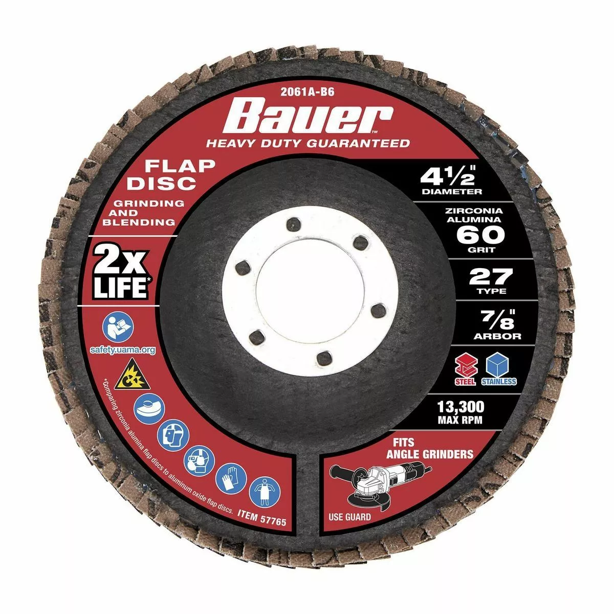 The BAUER™ 4-1/2 in. x 7/8 in. 60-Grit Type 27 Flap Disc is constructed with high quality Zirconia Alumina grain that lasts up to 2X longer* for fewer disc changes. Flexible flap plates conform to surfaces for grinding and blending on curves and contours. This disc delivers high performance on carbon steel and stainless steel applications.