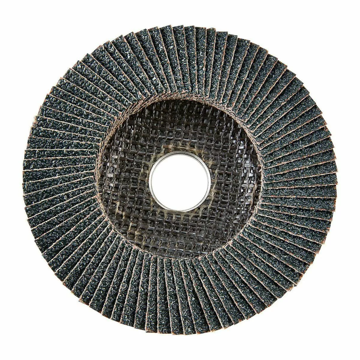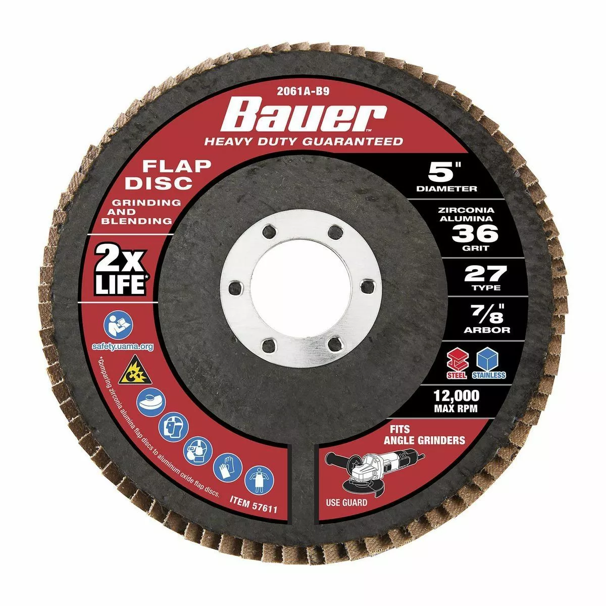 The BAUER™ 5 in. x 7/8 in. 36-Grit Type 27 Flap Disc is constructed with high quality Zirconia Alumina grain that lasts up to 2X longer* for fewer disc changes. Flexible flap plates conform to surfaces for grinding and blending on curves and contours. This disc delivers high performance on carbon steel and stainless steel applications.