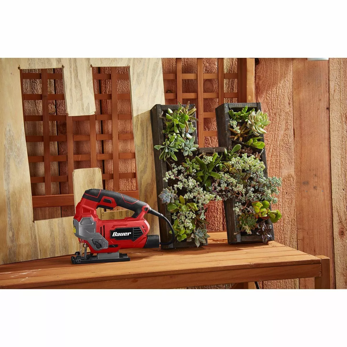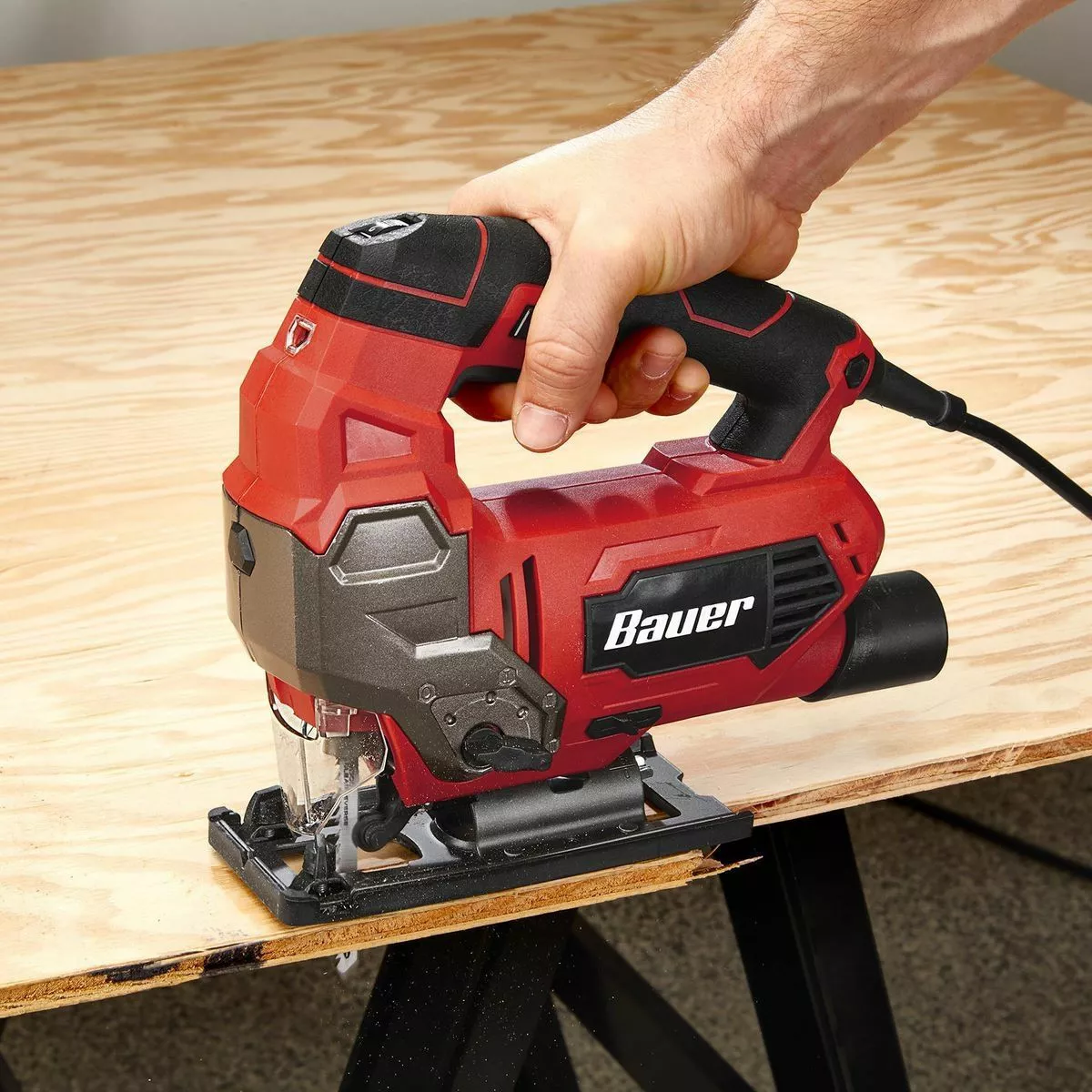 The BAUER™ orbital jigsaw has a four-position orbit selector for super-smooth cuts in a wide variety of materials. A red laser line gives you a clear line of cut for smoother, cleaner and safer cuts. The laser on this orbital jig saw is trigger activated so it’s ready when you need it.