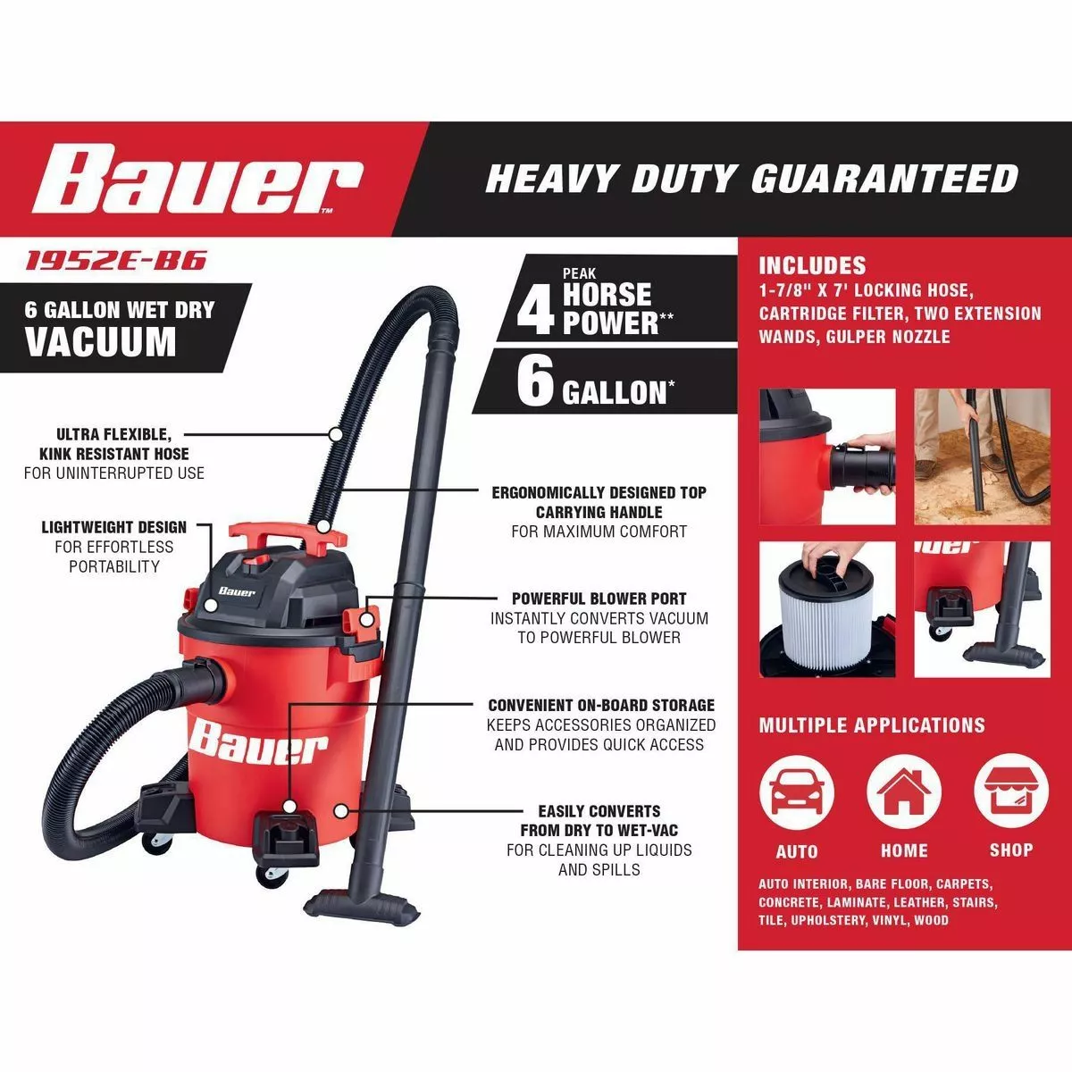 The BAUER™ 6 gallon wet/dry vac delivers 4 peak horsepower** of powerful suction for cleaning up liquids and spills. This wet/dry vac is designed with an ergonomic top carrying handle for maximum comfort, a convenient cord wrap for storing the 10 ft. power cord, ultra flexible, kink resistant 7 ft. hose for uninterrupted use and portable, lightweight design ideal for shop and home use. Includes convenient on-board storage for keeping accessories organized and easy access all in compact design that’s easy to store.